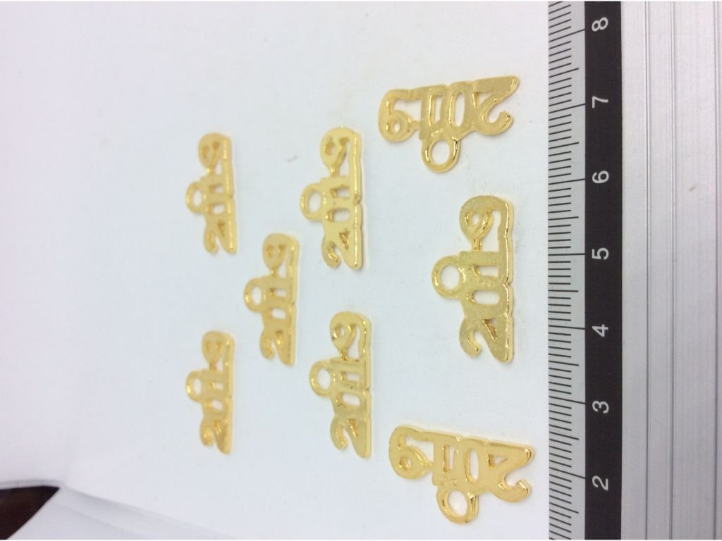 8 charms 2019 14x25mm gold plated, zinc alloy based.